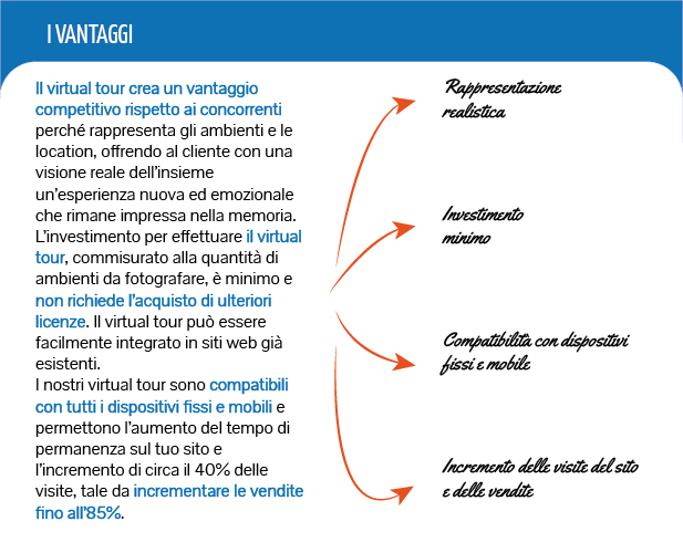 Un sito web aggiornato e ricco di contenuti è il biglietto da visita ideale per presentare e promuovere la vostra azienda. Una grafica accattivante e una struttura ottimizzata per i motori di ricerca rappresentano il punto di partenza ideale per conquistare la rete. L’interesse del potenziale cliente sarà sicuramente amplificato dalla presenza dei virtual tour, la vera marcia in più del vostro sito web.